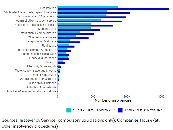These were also the three sectors with the most insolvencies in the 12 months ending Q1 2021. The construction industry usually has the highest quarterly number of insolvencies of any industrial grouping.